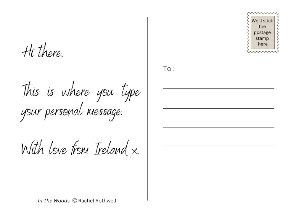 Añade tu mensaje personal. Imprimiremos tu postal y te la enviaremos por correo a través del servicio postal irlandés.
