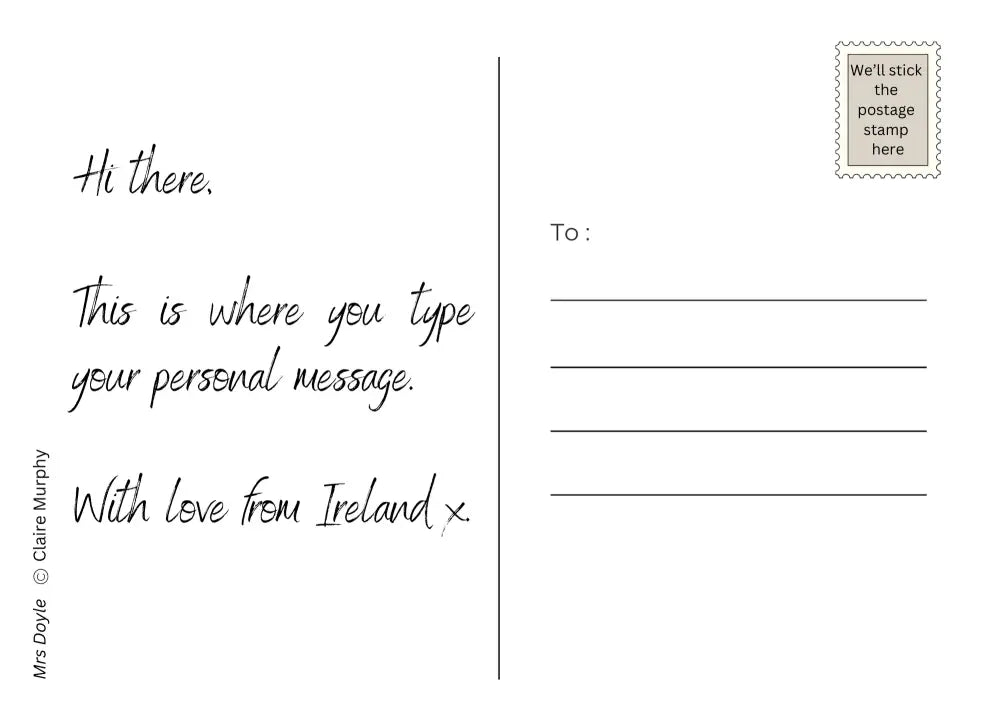 Añade tu mensaje personal. Imprimiremos su postal y se la enviaremos por correo a través del servicio postal irlandés.