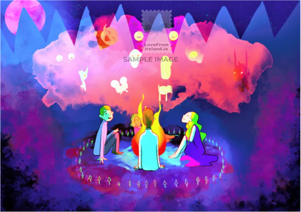 Friends gather around a campfire, inside a fairy ring. Ireland's mythological creatures hide in the background.